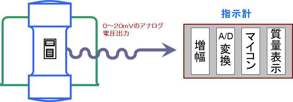 ロードセル(2mV/Vでアナログ校正)からアナログ信号(微弱電圧値)をケーブル経由で出力します。(指示計でデジタル変換を行います。)