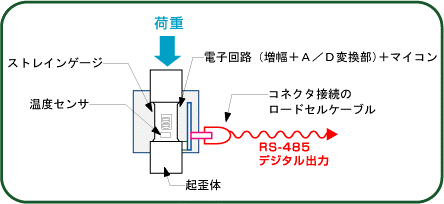 デジタルロードセルは、ロードセル本体に増幅部、A/D変換部、演算部、通信部を組み込むことで、信号をデジタル変換して出力します。また温度センサも搭載し、温度変化による出力誤差を自動補正します。
