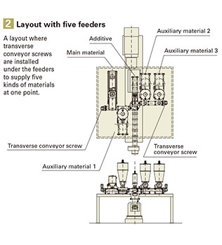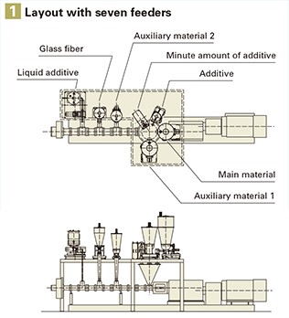 樹脂原料の高機能化に伴い、一台の押出機に供給される原料種類が増えています。従来の製造プロセスでは、ミキサーなどを使用して複数の原料をプリブレンドしたものをフィーダで供給していました。近年ではフィーダの高精度化により、複数の原料を押出機へ直接供給するプロセスが主流になっています。